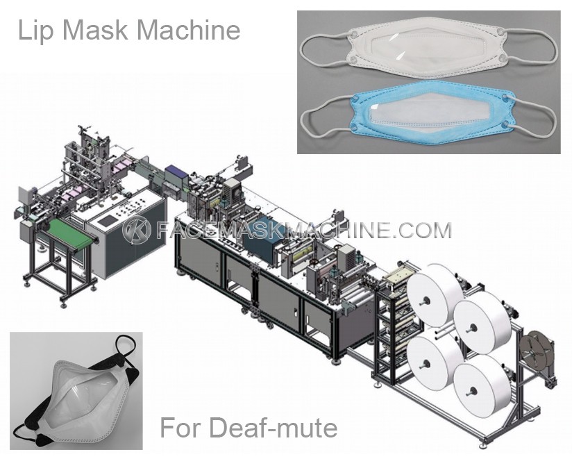 It is fully automatic production line from raw materails feeding, transparent film welding, face mask melt cutting, to ear loop weding and finished mask collection. The special feature of the mask is that the position of the mouth is changed to an open design, that is, a transparent film is placed to facilitate others, especially the hearing impaired, to communicate with the lips as usual.
